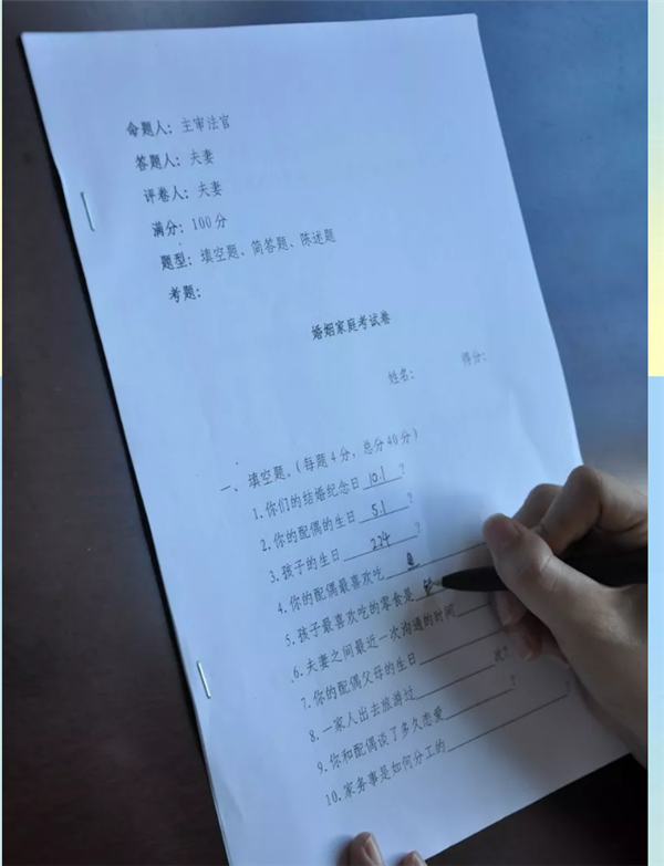 7月16日,太和法院家事审判庭在处理一起离婚案件时,首次在调解过程中引入“婚姻试卷”。